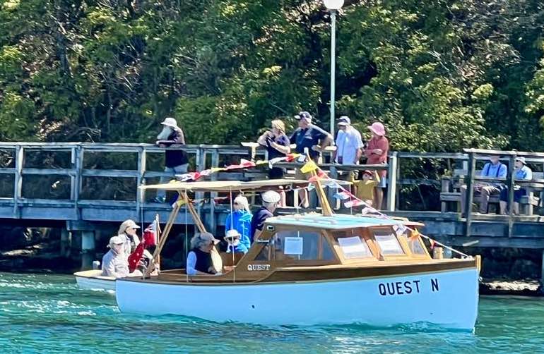 Brilliant sunshine on Sunday saw the fleet head down the channel and under the bridge for the Grand Parade along the Mill Bay Boardwalk. The public took advantage of the weather to line the Boardwalk and crowd the bridge to enjoy and cheer on the traditional boats on show.